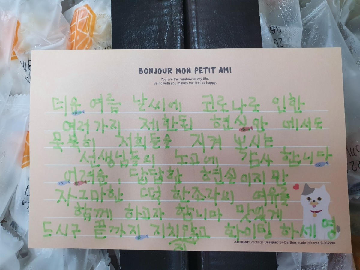 더운 여름 시원한 마음에 힘이 납니다~ 페이지 정보 조회 836회 작성일 21-07-23 11:08 본문 복지관을 이용하시는 한명* 님이 더운 여름 힘내라며 직원들에게 떡을 선물해주셨습니다.전날 퇴근 시간이 다 되어 떡이 와서 냉동에 넣었다 오늘 갖고 오셨다고 합니다. 더운 날씨를 뚫고 시원한 떡과 함께 직접 정성 가득 쓰신 손편지를 들고 오셔서 수줍게 건네주시는 모습에 직원 모두 감동했습니다. 모두들 맛있게 잘 먹었습니다.응원해주시는 마음에 들썩들썩 힘이 납니다^^감사한 마음으로 힘내서 열심히 달리겠습니다~ 목록